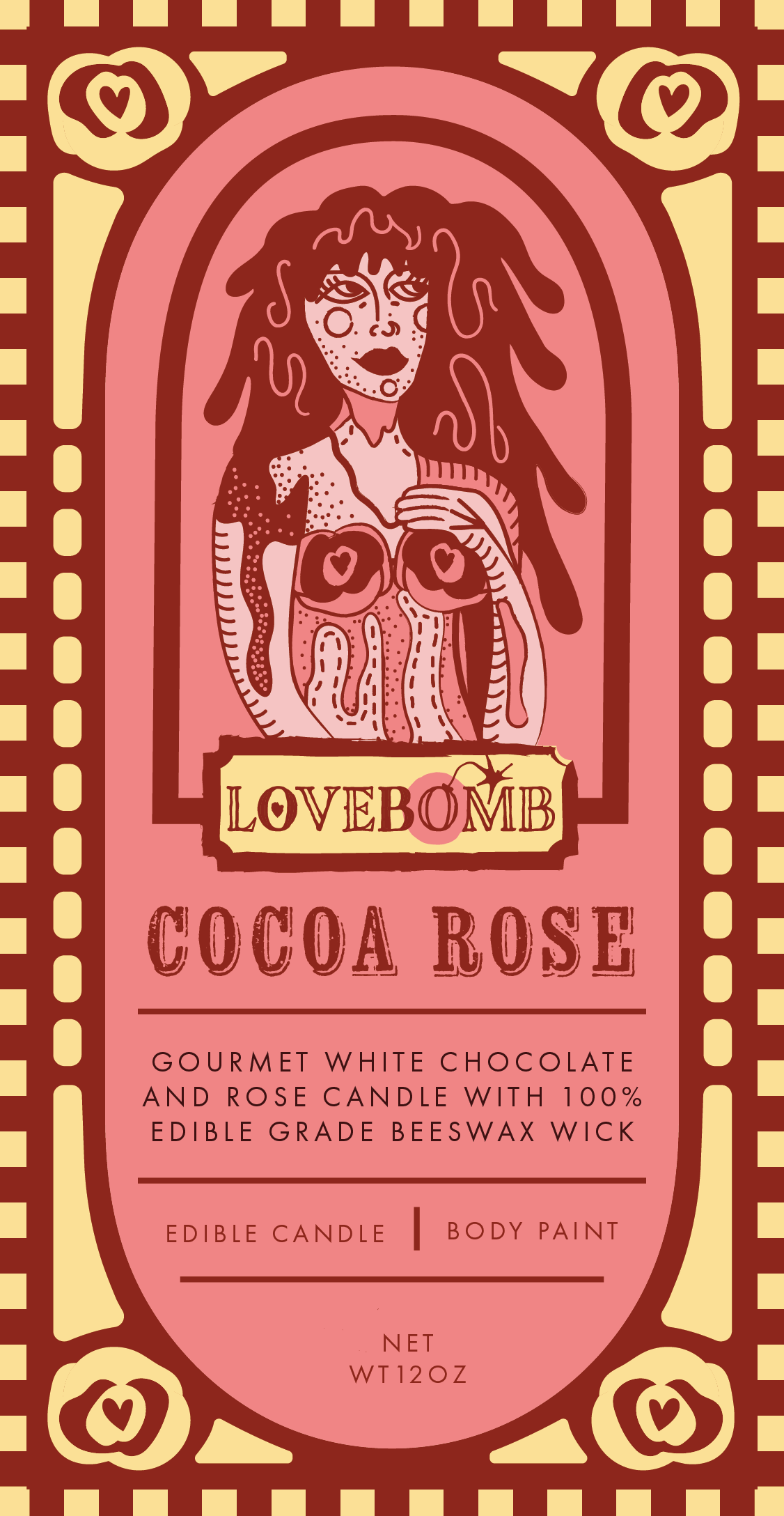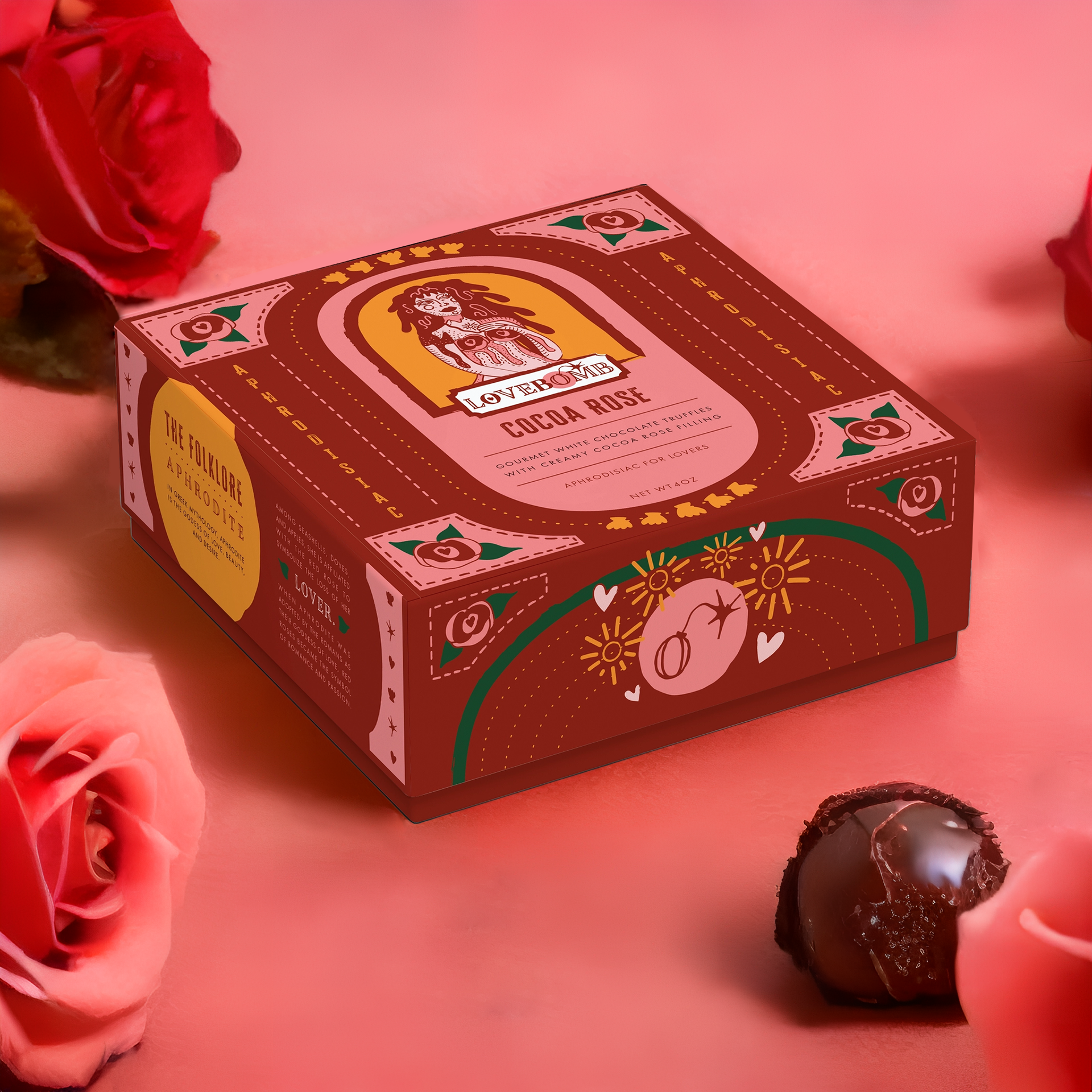 LOVEBOMB is an aphrodisiac chocolate line that explores sensuality between lovers. The heavenly taste inspires divine attraction through the release of endorphins and anti-anxiety hormones. Cocoa rose, pomegranate cream, and rich honey fig are paired with chocolate across the forms of an edible candle, truffles, and wine. The packaging includes a folky style and detailed illustrations of Greek gods including Aphrodite, Persephone, and Dionysus with their respective symbology. Mokker.ai and Midjourney Bot were utilized to create AI generated silky backdrops for the products to be displayed in. None of these generated images contain real photography but give a sense of the richness and moodiness of the desserts.